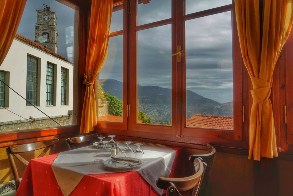 Επιλέγουμε τραπέζι κοντά στο τζάκι ή την πολυπόθητη prive γωνιά στο μπαλκονάκι με θέα το Ρολόι της Αράχωβας και απολαμβάνουμε τις καλομαγειρεμένες συνταγές και τις ψητές λιχουδιές. Από τις προτάσεις της ντόπιας παραδοσιακής κουζίνας ξεχωρίζουν τα μαγειρευτά πιάτα συνδυασμένα με ζυμαρικά ή χυλοπίτες δικής τους παραγωγής, γευστικά κρεατικά της ώρας σιγοψημένα που κρατούν τα ζουμιά τους, οψιμοτύρι ή το παραδοσιακό αραχωβίτικο τυρί την φορμαέλα, πληθωρικές σαλάτες από ολόφρεσκα υλικά και μεγάλη ποικιλία από ορεκτικά που ανοίγουν την όρεξη για τα καλά.
