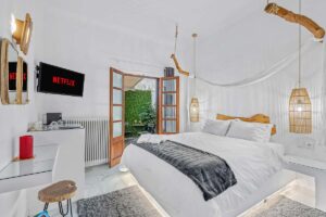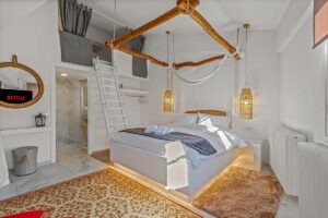 It is newly refurbished (2019) with 1 queen-sized bed, 1 sofa bed, 1 double sized bed (in the loft) and 1 single bed (in the loft). It has 1 bathroom with shower and one WC. A radiator for heating, a mini-fridge and amenities.