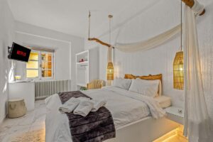 It is newly refurbished (2019) with 1 queen-sized bed, 1 sofa bed, and 2 single beds (in the loft). It has 1 bathroom with shower and one WC. A radiator for heating, a mini-fridge and amenities.