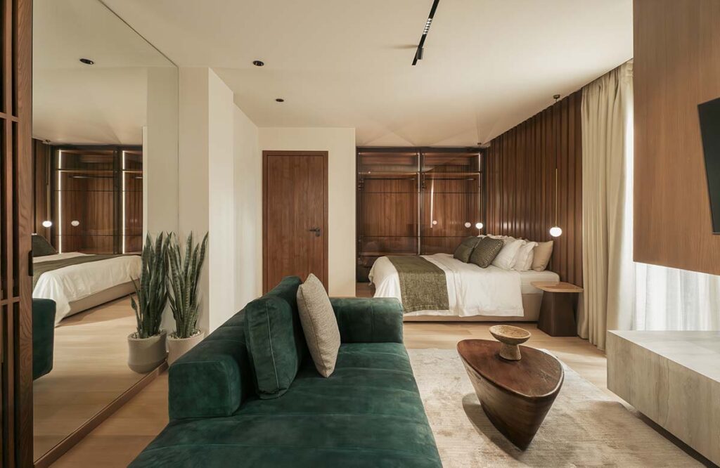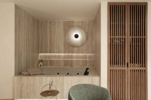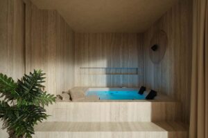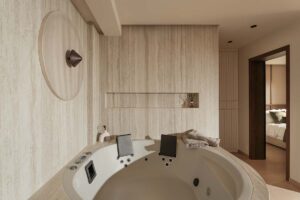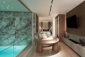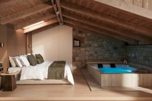 The Grand Penthouse Suite spans two levels, uniquely blending comfort and luxury. The ground level and loft are filled with natural light and tranquility, creating a relaxing ambiance enhanced by natural materials like stone and wood. The indoor pool and jacuzzi, combined with a counter-current swimming feature, offer a rejuvenating wellness experience.
