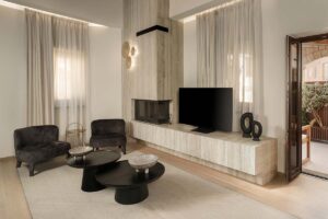 The Ceci Suite, the most exquisite suite in the building, is located at the highest point, offering a spacious terrace with stunning views of the picturesque village and the majestic Mount Parnassus. Modern minimalism blends with natural materials, such as wood and exposed ceiling beams, creating an atmospheric and warm space. In the suite's open-plan area, you'll find a comfortable double bed with a steam fireplace, while the recessed indoor Jacuzzi provides the ultimate sense of depth and relaxation.