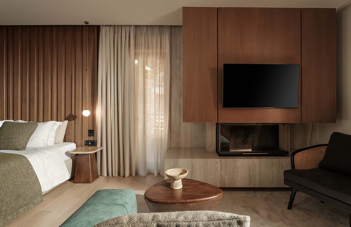 The Grand Suite is designed as an open-plan space with a double bed, combining luxury and comfort. It features an elegant sitting area with an energy-efficient fireplace, an indoor jacuzzi for moments of complete relaxation, and a modern bathroom. Its contemporary amenities include a fully equipped kitchenette and a spacious wardrobe, while the smart room system allows you to personalize the space to suit your preferences.