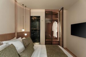 The suite’s fully equipped kitchen includes an espresso machine for your coffee enjoyment, and the room is outfitted with smart systems for maximum comfort. It also includes a wardrobe and cloakroom for your needs, while heating is provided by a heat pump for a pleasant stay year-round.