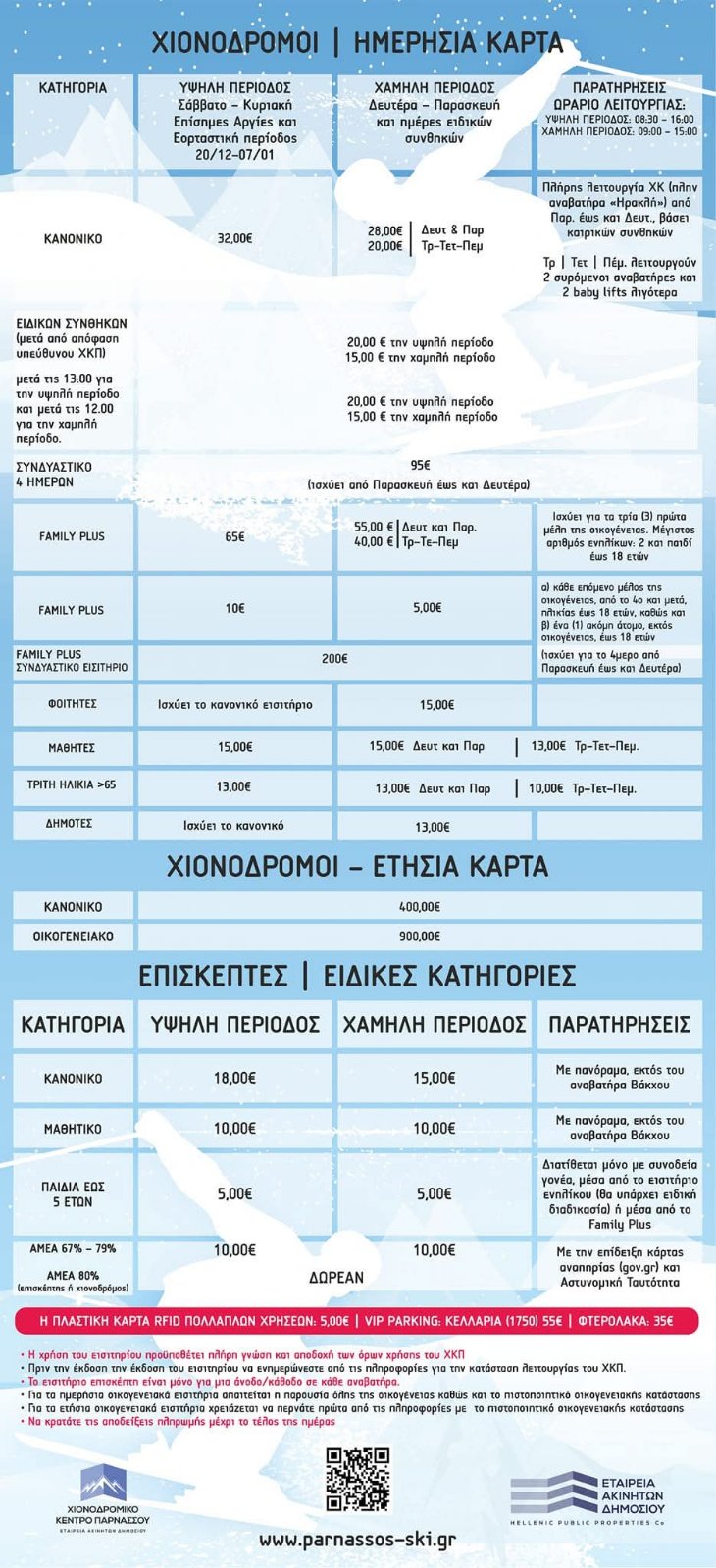 - Το ημερήσιο οικογενειακό εισιτήριο στην υψηλή περίοδο θα είναι 65€ για τα 3 πρώτα μέλη της οικογένειας και 10€ για το κάθε επιπλέον μέλος από το 4ο και μετά. Η ετήσια οικογενειακή κάρτα κοστίζει 900€.