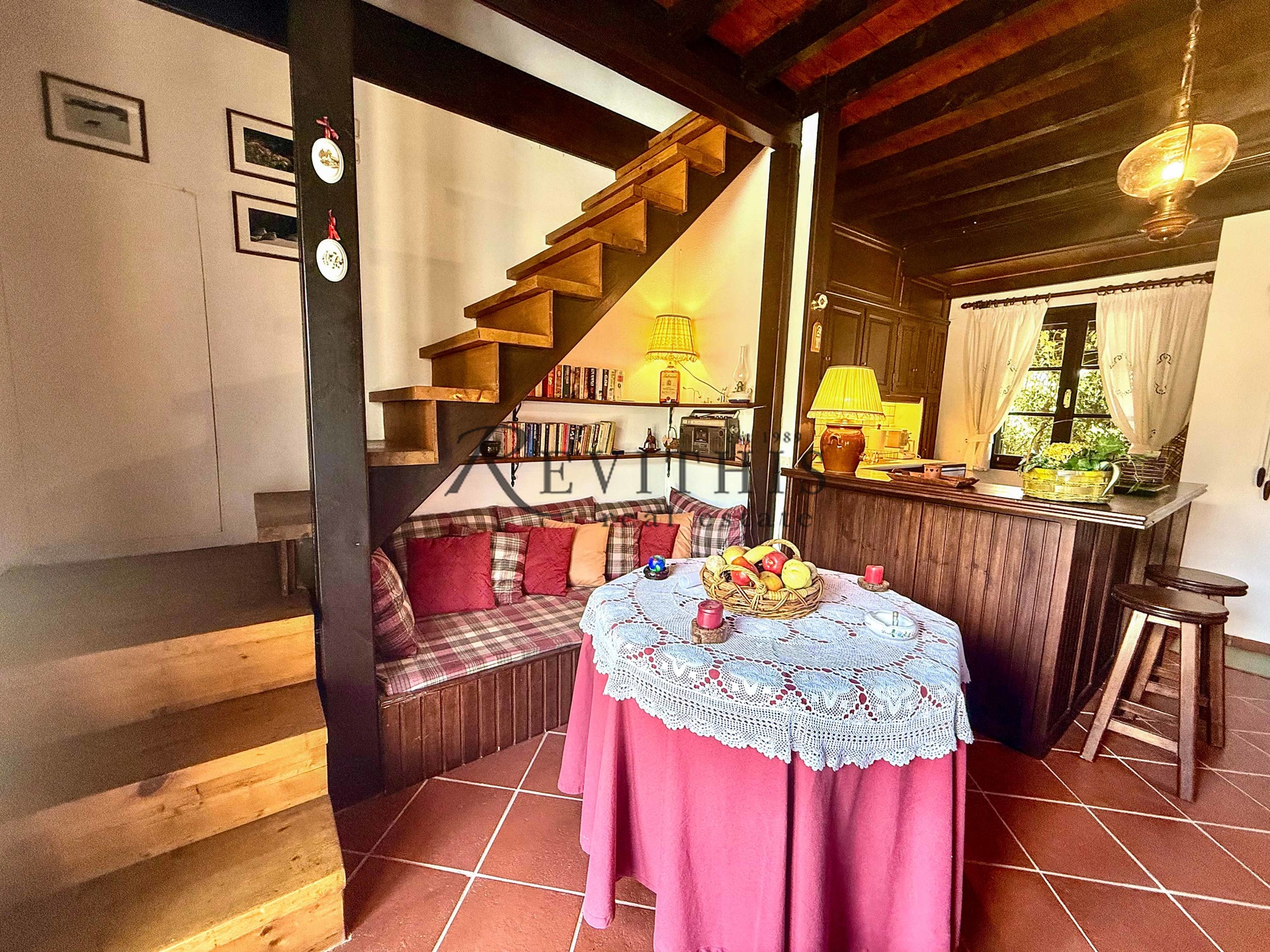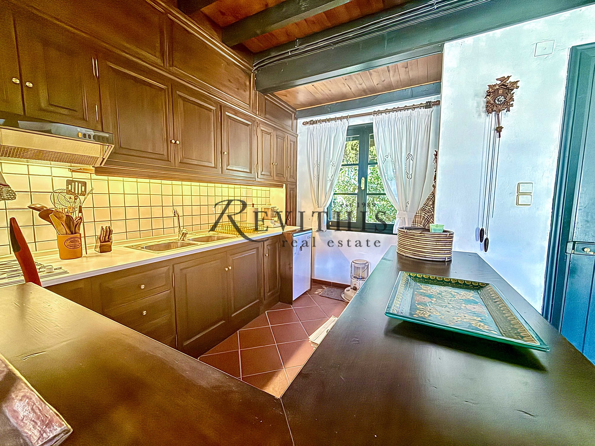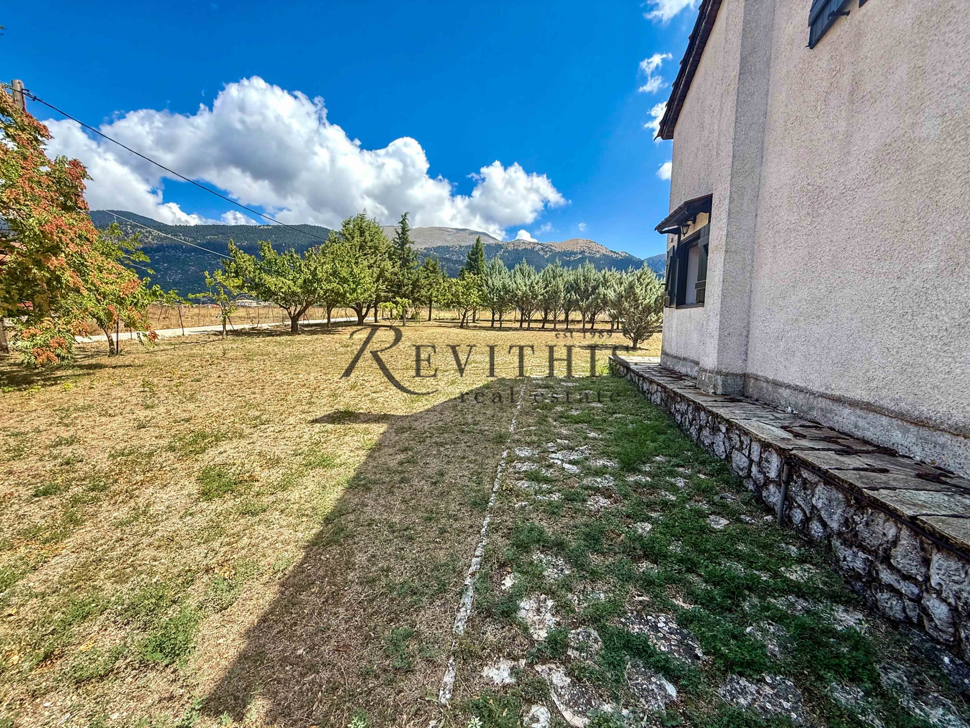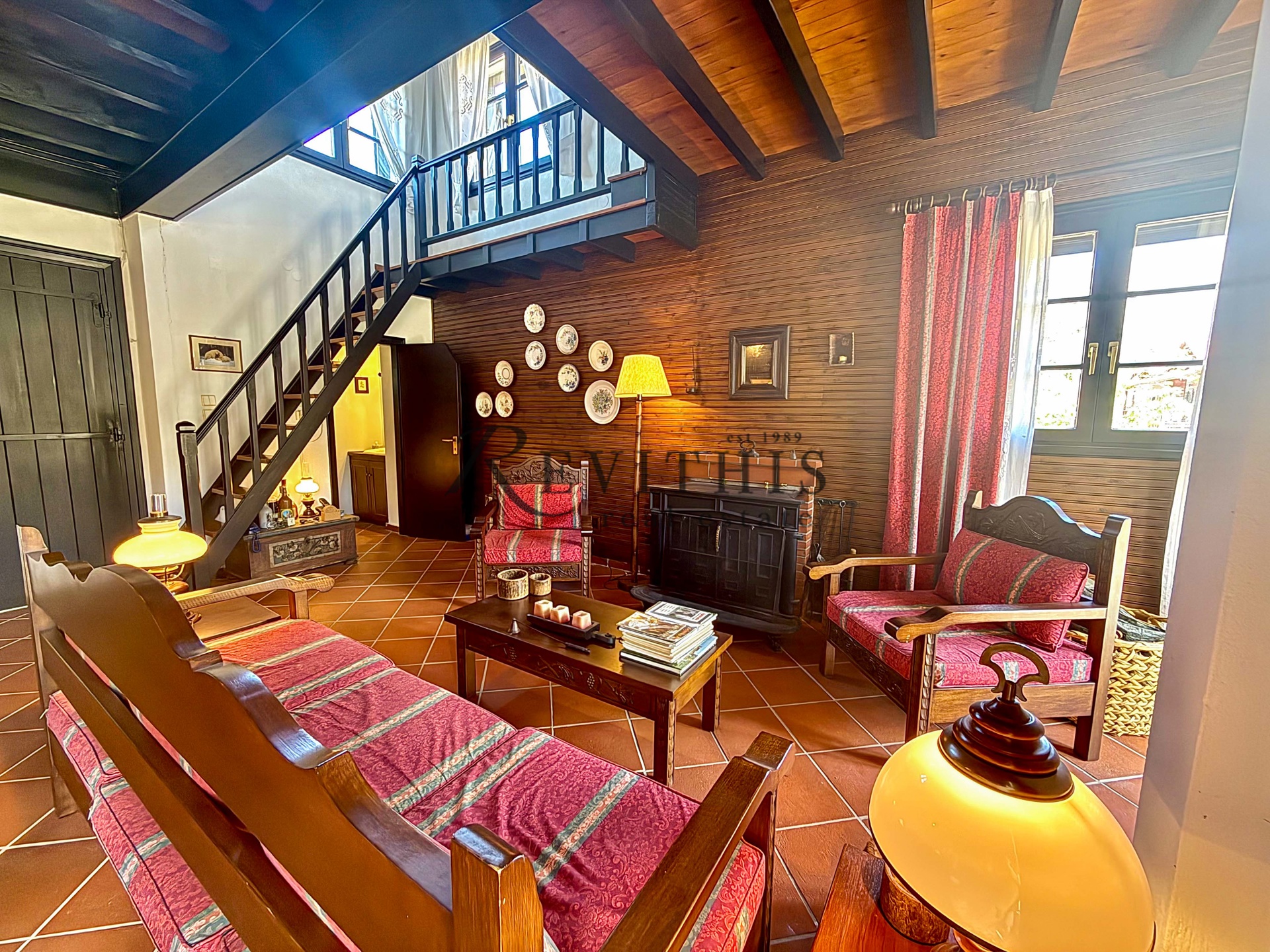 Διαθέτει τζάκι με μαντεμένια πρόσοψη, στόφα, χώρο στάθμευσης και αποθήκη.